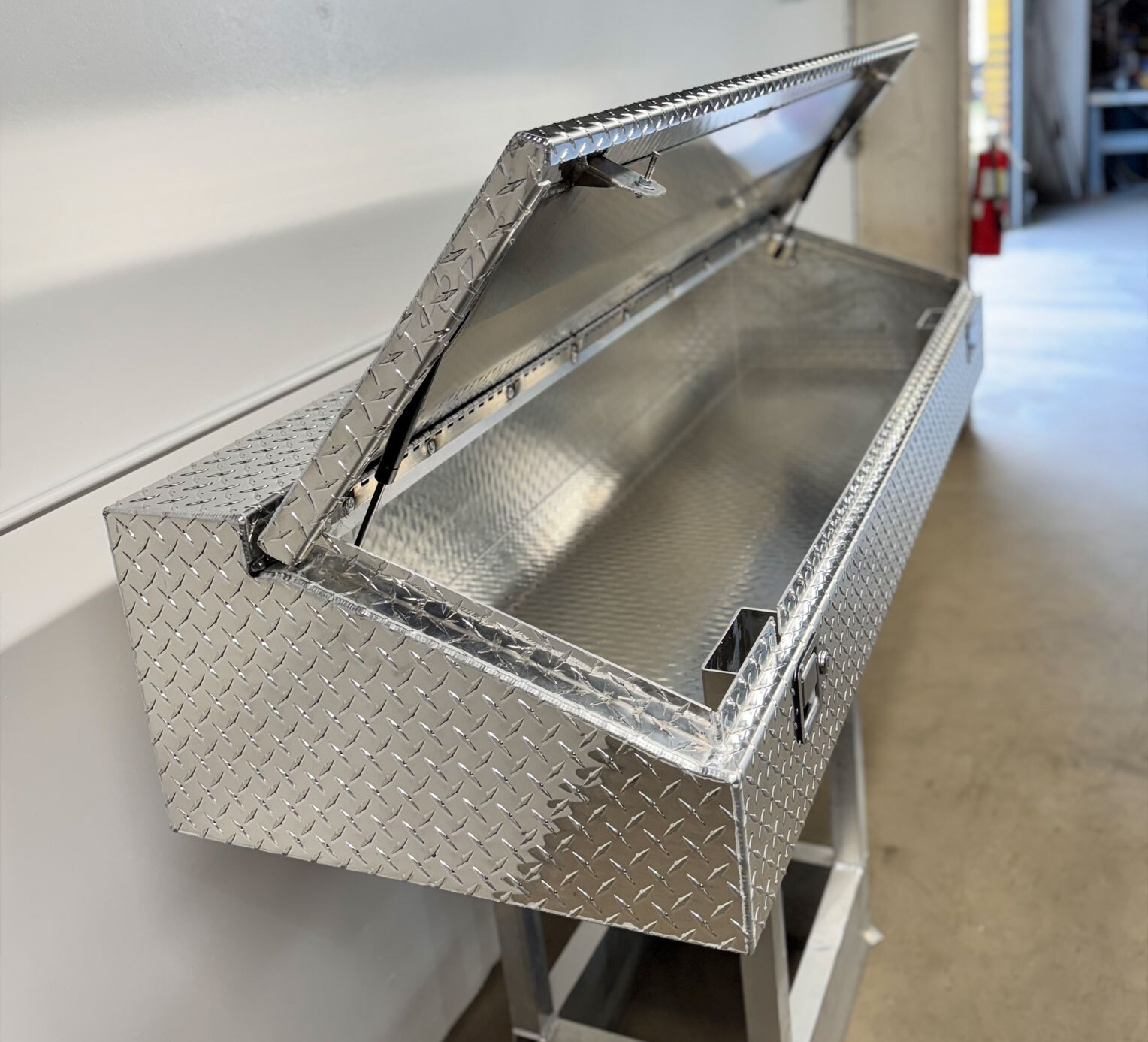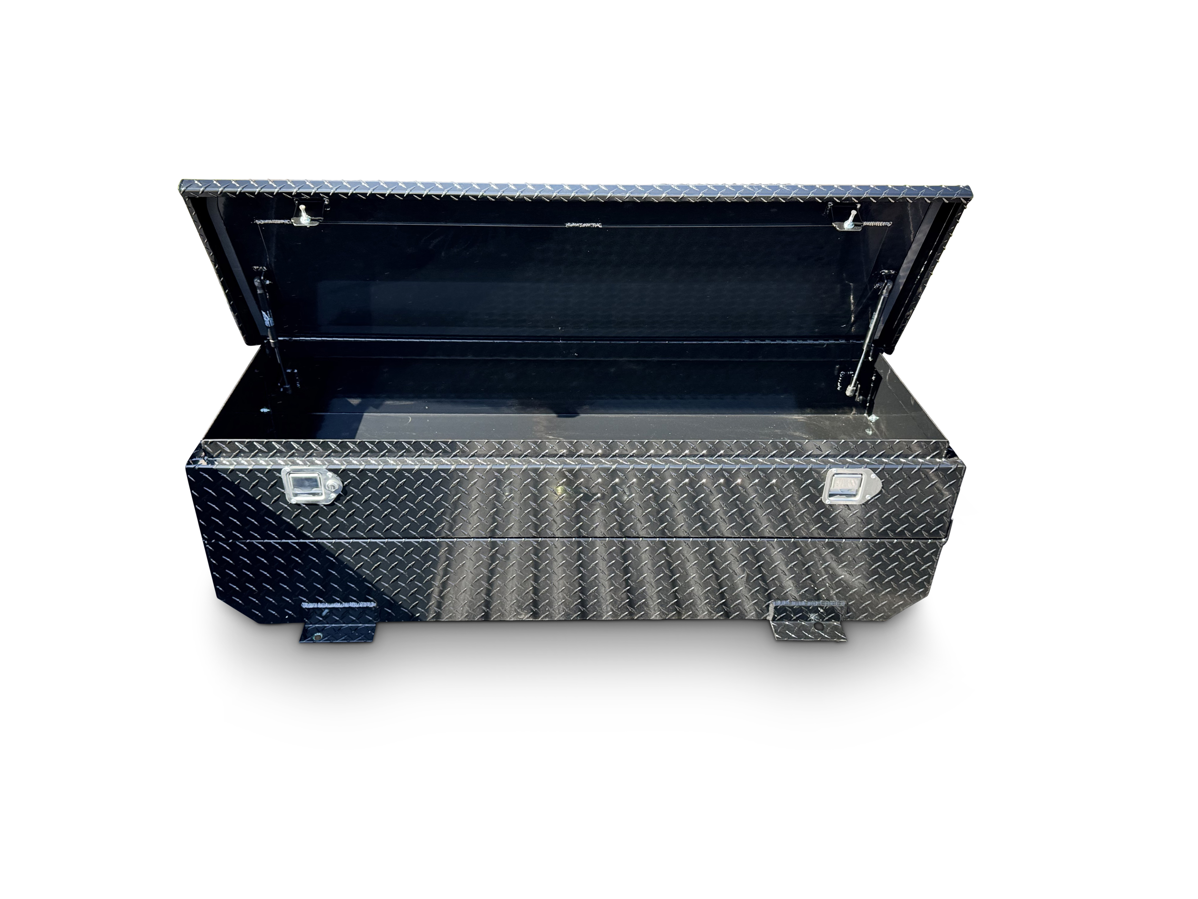 Toolboxes come with Locking Stainless Steel Paddle Latches, Gas Shocks, Heavy Duty Foam Weather Stripping, and a Rigid Lid Stiffener Plate. Fuel Tanks and Toolboxes are bolted together using stainless steel carriage bolts.