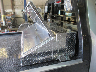 The AT44RWB, the 44-gallon rectangular auxiliary tank with a wedge style toolbox, has become a growing leader in fuel tank/toolbox combos. The unique design gives you 44 gallons of fuel capacity and a unique wedge style toolbox with the Hauler Bed or Flatbed in mind. A standard rectangular tank and toolbox combination can cause clearance issues with trailers. All ATTA tanks are constructed from a minimum of 1/8” (.125 gauge) aluminum and Heavy Duty 3/16” (2” x 6”) Hold-down Tabs. Comes standard with dual fuel filler necks and locking fuel caps, unlike our competitors. The bolt-on wedge style toolbox is constructed from the same 1/8” aluminum as the fuel tank giving you a long-lasting toolbox.