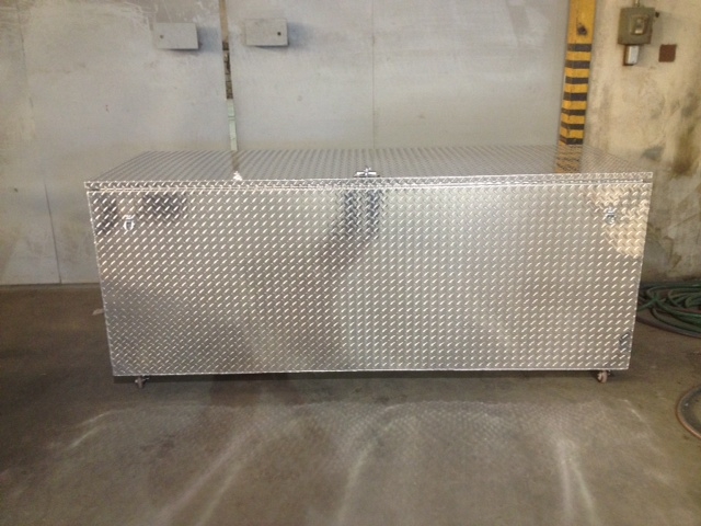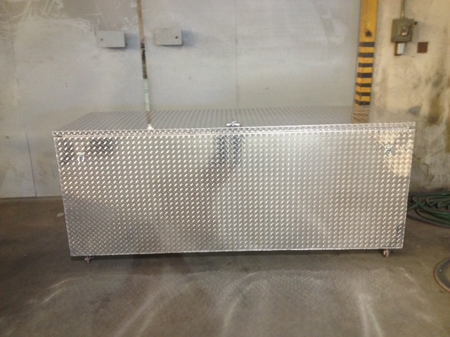 Custom trade show box with locking swivel casters and locking T-handle. The trade show box is constructed in similar style as our toolbox. Overall Dimensions are 40" tall x 34" wide x 96" long.
